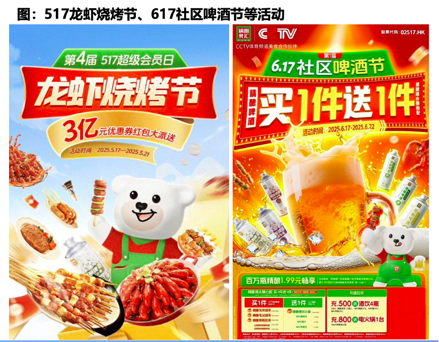 经典案例:根据公司招股说明书、公司公告,锅圈食汇微信公众号、网易新闻、大众新闻、国海证券研究所等综合资讯表明,锅圈食汇公司举办首届社区啤酒节,主推“精酿啤酒买一箱送一箱”,拼团优惠力度最高约为40%(即6折),消费者可享小龙虾、牛排、酸菜 鱼火锅等爆品拼团优惠,以及百万瓶精酿1.99元畅享券、充值赠、精酿品类券、小龙虾第二件半价券、会员积分兑等多重优惠。