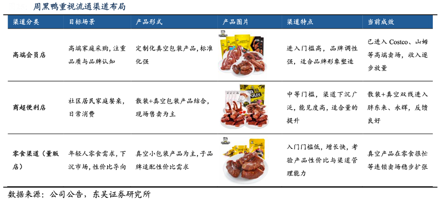 经典案例:根据公司公告、东吴证券研究所等综合资讯表明,周黑鸭针对不同渠道,匹配不同的产品组合:标准化产品投放于传统渠道;头部渠道、头部客户则采取定制服务;下沉、性价比渠道如零食量贩,公司将启动子品牌覆盖。目前周黑鸭真空产品已成功入驻 Costco、零食很忙等连锁卖场,并稳步开拓其他流通零售渠道。截至 2024 年底,真空产品收入占比已达 11%。