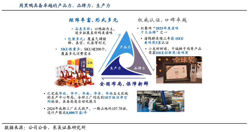 经典案例:根据公司公告、东吴证券研究所等综合资讯表明,周黑鸭具备卓越的产品力、品牌力、生产力。