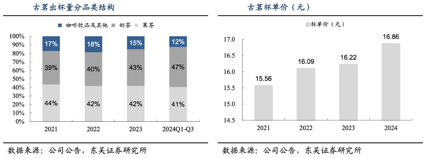 经典案例:根据公司公告、东吴证券研究所等综合资讯表明,古茗聚焦大众现制茶饮市场,产品以果茶(含果蔬汁)、奶茶(含轻乳茶)和咖啡及其他(含纯茶、酸奶奶昔、烘焙和周边等)为主,2024Q1-3 果茶/奶茶/咖啡及其他出杯量占比为 41%/47%/12%,轻乳茶带动奶茶占比提升,产品定价稳定在 10—18 元区 间。