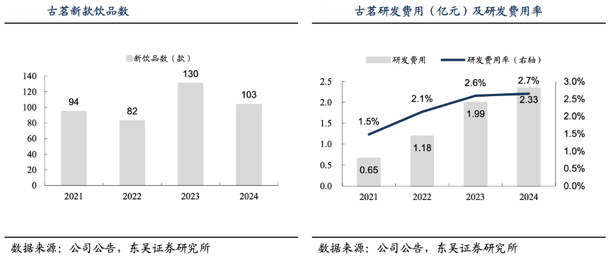 经典案例:根据公司公告、东吴证券研究所等综合资讯表明,古茗拥有专业的产品研发团队,其研发平台依托供应链优势,将受欢迎的新品快速推广至下沉市场,抓住行业流行趋势,提高用户黏性,实现“每天一杯喝不腻”的目标。2021-2023 年的十大畅销饮品包括同年或上一年推出的 2-3 款新品,2024 年共推出 103 款新品。