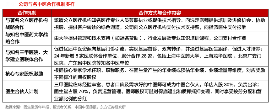 经典案例:根据固生堂历年年报、投资者关系、中国中医药报、东方证券研究所等综合资讯表明,固生堂通过与公立医疗机构战略合作、医联体合作等吸引名中 医多点执业,再结合医生合伙人和股权激励等措施深度绑定名中医。截至 24 年底,其已拥有 8 名国医大师、79 名全国名中医,线下合作医生 6052 人,其中资深中医师占比达 47.0%,网络合作医生共计 40242 人,资深中医师占比37.5%。
