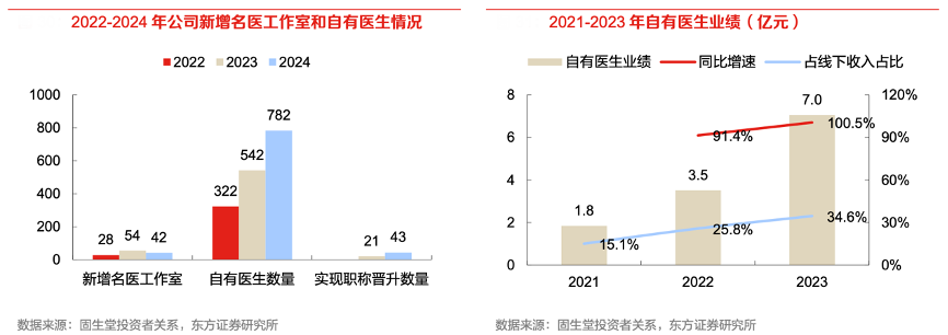 经典案例:根据固生堂投资者关系、东方证券研究所等综合资讯表明,固生堂公司通过名医传承工作室的建设,让自有青年医生与名老中医建立“师带徒”关系,跟随大师抄方学习,实现中医学术思想和临床经验传承和快速成长。 2022-2024年,自有医生数量及实现职称晋升数量不断增加,助力业绩增长。2023 年,自有医生业绩达 7 亿元(+100.5%),线下占比达 34.6%。