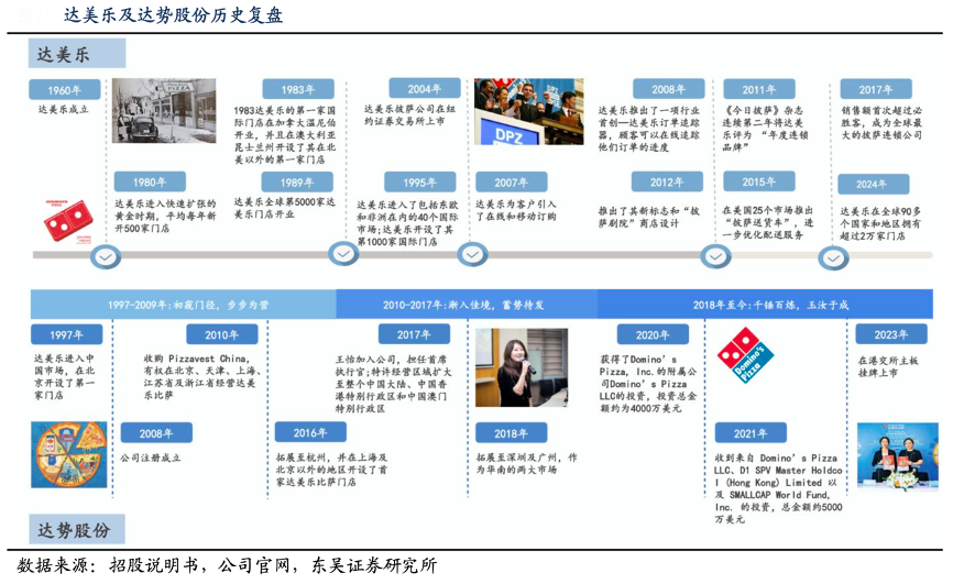 经典案例:根据招股说明书、公司官网、东吴证券研究所等综合资讯表明,2018 年 8 月、11 月达美乐公司成功扩张至深圳及广州,标志着全国化布局取得重大突破。由点及面、精耕细作,2023 年公司于香港成功上市,截至 2024 年底,公司门店已成功扩展至 39 个城市,门店总数达 1008 家。