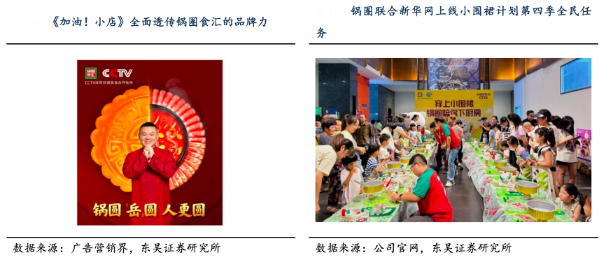 经典案例:根据广告营销界、公司官网、东吴证券研究所等综合资讯表明,2021 年锅圈食汇成为 CCTV 体育频道的美食合作伙伴;2022 年公司精准锁定《加油!小店》和 《暖暖的火锅》两档卫视热门综艺,以此建立年轻大众化沟通阵地;2024 年 7 月公司联 合新华网上线暑期档全民任务——小围裙计划第四季。