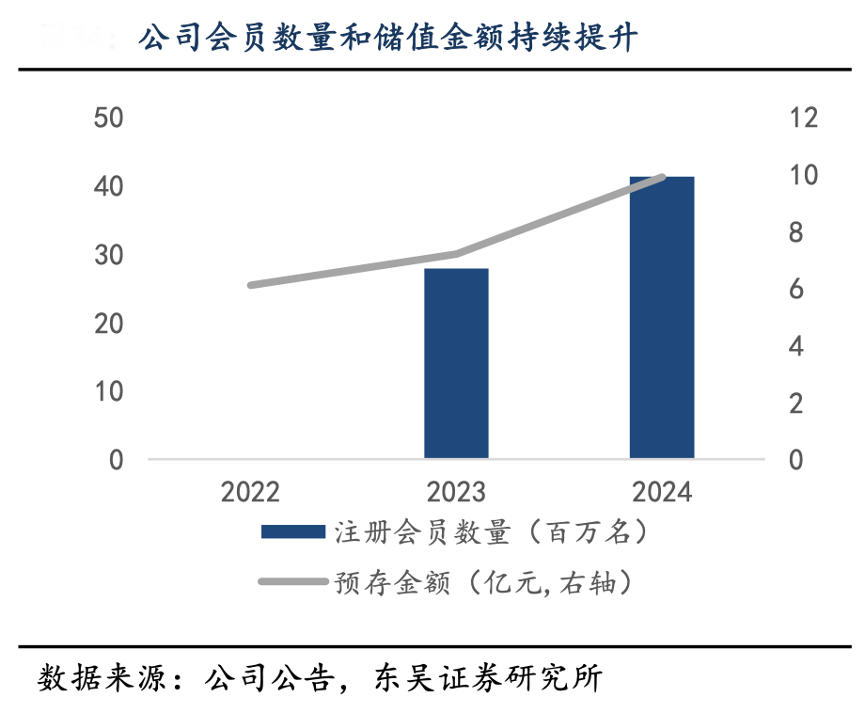 经典案例:根据公司公告、东吴证券研究所等综合资讯表明,锅圈截至 2024 年底注册会员数量达到 4130 万,同比增长 48.2%。公司预存卡金额也有逐年提升的趋势,从 6.1 亿元提升到 9.9 亿元,且当年的预存卡消化率基本都维 持在 80%上下。