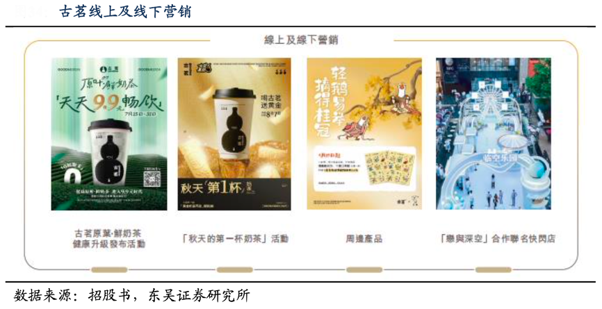 经典案例:根据招股书、东吴证券研究所等综合资讯表明,在营销创新层面,古茗展现出敏锐的热点捕捉能力,2023年与《天官赐福》联名活动创下三天 670 万杯的销售记录,2024年“秋天的第一杯奶茶”单日 GMV 突破 1.6 亿元。