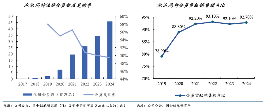经典案例:根据公司公告、国金证券研究所等综合资讯表明,泡泡玛特的核心消费客群为 15-35 岁、月均消费能力较强,且具有较强社交分享属性的年轻群体,企业采用分层会员制度并搭建线上互动平台。目前,中国内地的平台注册会员总量由 2017 年 30 万人增长至 2024 年的 4608.3 万人,会员贡献当期总销售额的 92.7%,平均复购率达 49.4%。