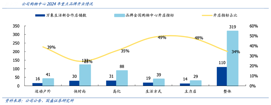 经典案例:根据公司公告、国盛证券研究所等综合资讯表明,华润凭借多年深耕,其购物中心数量居于行业前列,截止 2024 年,公司已合作品牌数量近 15000 个,在营品牌数量超 7800 个;年内重点品牌全国新开门店数占比34%,其中主力店和生活方式品牌近半指标落于万象生活。